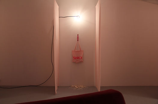 Dès ses premiers pas dans l’exposition, le.a spectateur.trice pénètre dans un territoire à l’allure commerciale saturé par l’inscription énigmatique SNO. Le complexe est scindé par des pans de rideaux rose pâle créant des compartiments renfermant des objets eux-même frappés du mystérieux emblème.